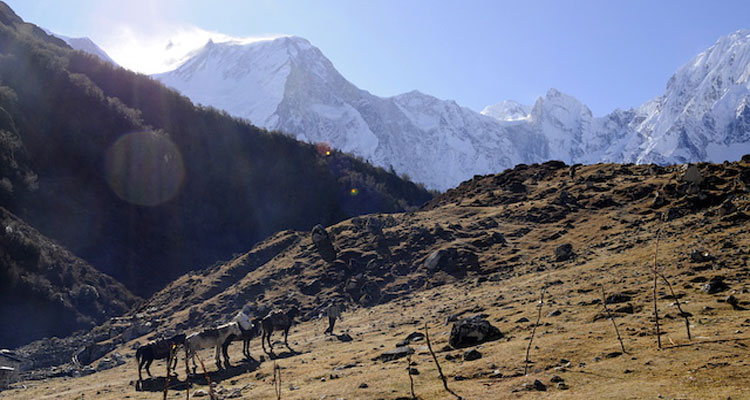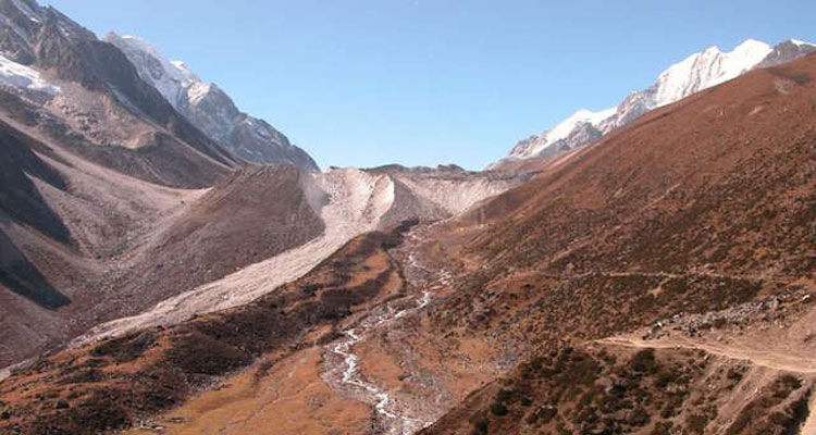 Après petit-déjeuner nous continuons à monter progressivement dans un paysage de pâturages d’altitude où paissent les yaks, sur la gauche, glaciers noirs et faces rocheuses austères. Longue montée panorama spectaculaire sur les sommets alentours environ 5/6h de marche pour atteindre le camp.