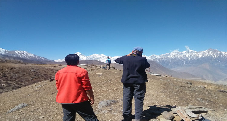 Descente, nous continuons par les champs en terrasse avant de monter une arête d'ici vous pouvez voir le Mt. Ghustung South (6465m). Descente vers la Myagdi Khola et le long de la rive ouest, village de Naura, montée courte avant de traverser une colline herbeuse, montagnes russes, et puis descente par une forêt et des champs en terrasse à Boghara. 6h de marche